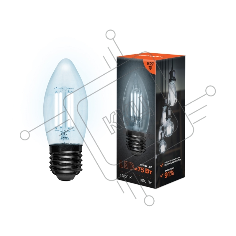 Лампа светодиодная филаментная Rexant Свеча CN35 9.5 Вт 950 Лм 4000K E27 прозрачная колба