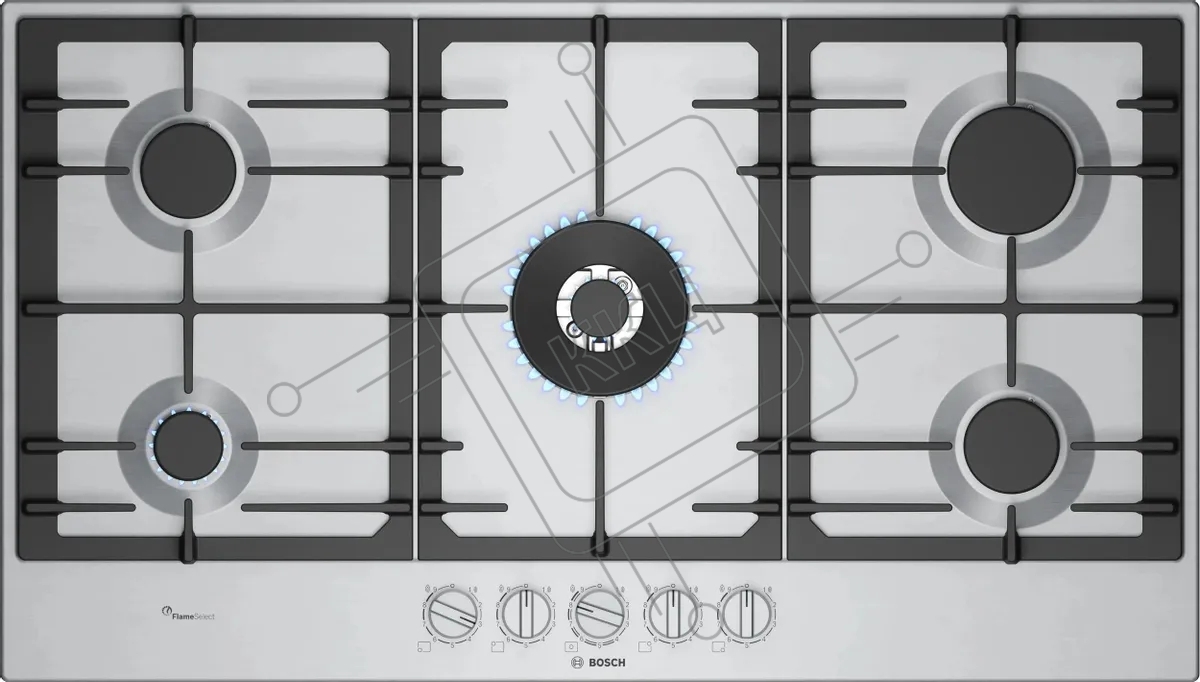 Газовая варочная панель Bosch PCR9A5I90M,90 см,нержавеющая сталь, 5 конфорок, 1 WOK-конфорка c 2 контурами пламени, 1 конфорка повышенной мощности,чугунные решетки,газ-контроль, автоматический электроподжиг