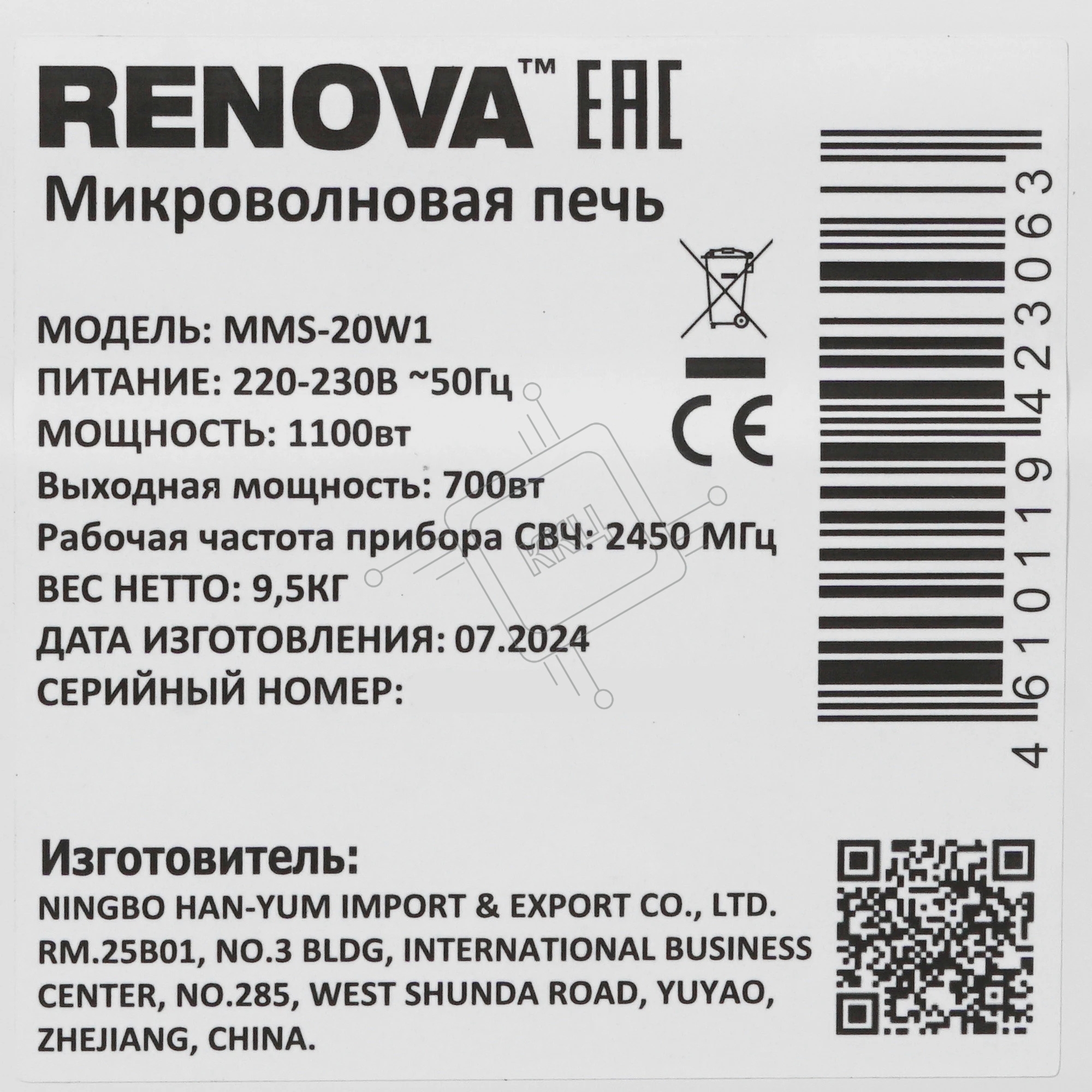 Микроволновая печь Renova MMS-20W1 белый/черный, 20 л, 700 Вт, переключатели - поворотный механизм