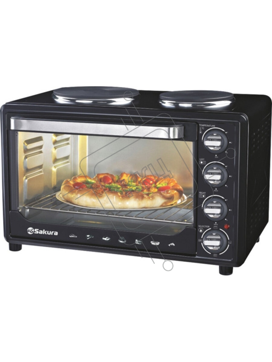 Мини-печь Sakura SA-7001HBK 35л, 3200Вт, духовка 1600Вт, конфорки 185мм+155мм (1000Вт+600Вт), механ.управление, 3 режима работы духовки (верх, низ, верх+низ), раздельная регулировка температуры духовки и конфорок, комплектация - металлическая решетка, про