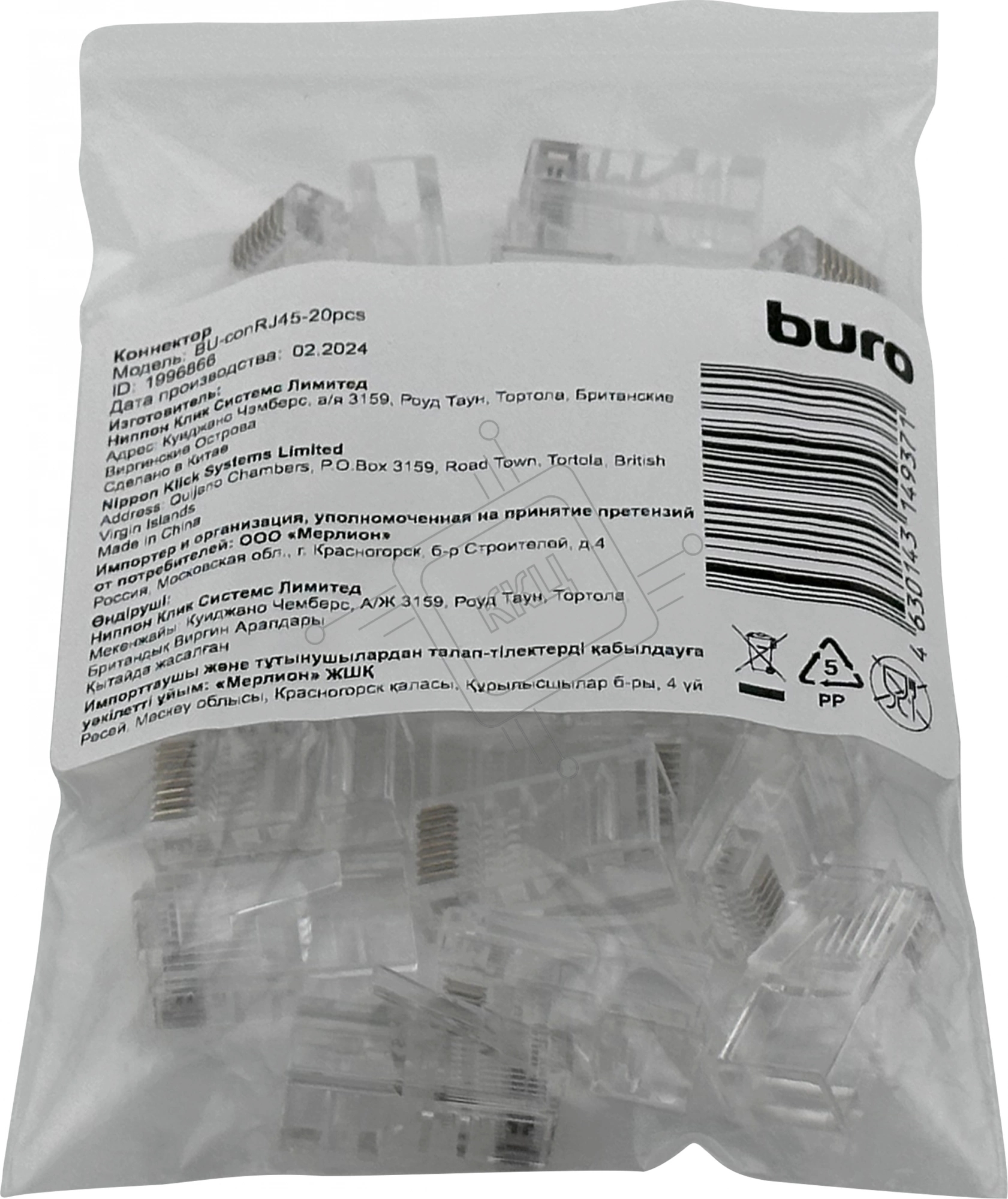 Коннектор Buro RJ45 прозрачный (упак.:20шт)