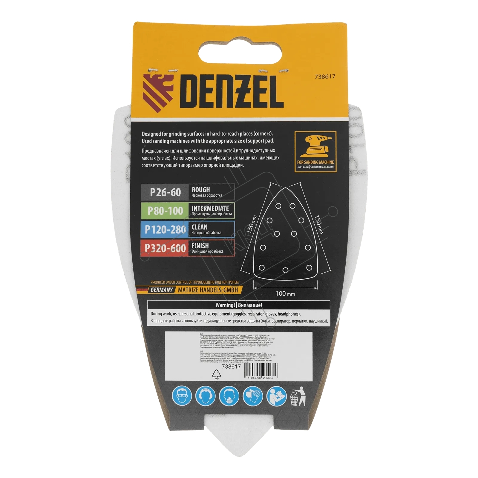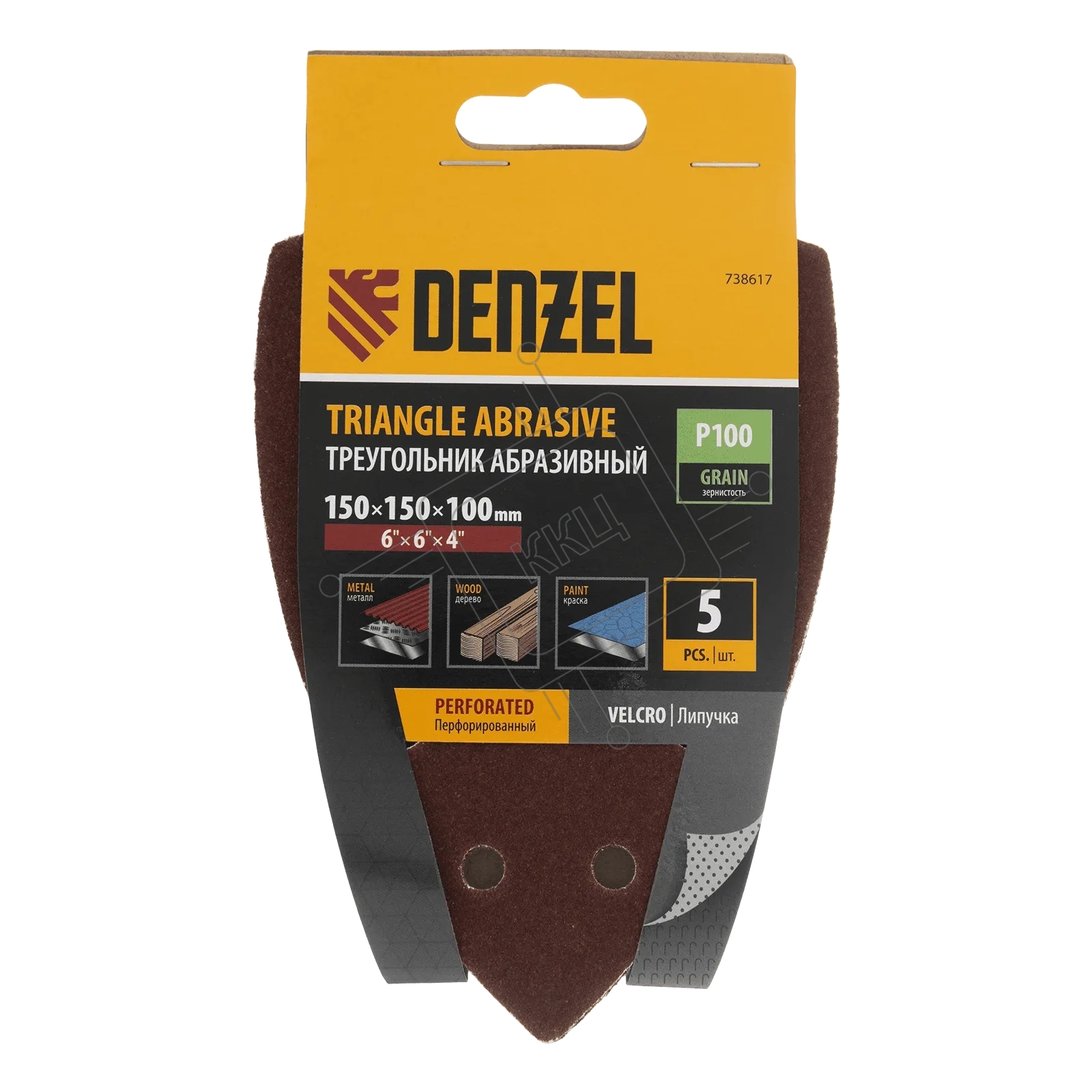 Треугольник абразивный Denzel на ворc. подложке под "липучку", перф., P 100, 150х150х100 мм, 5 шт.