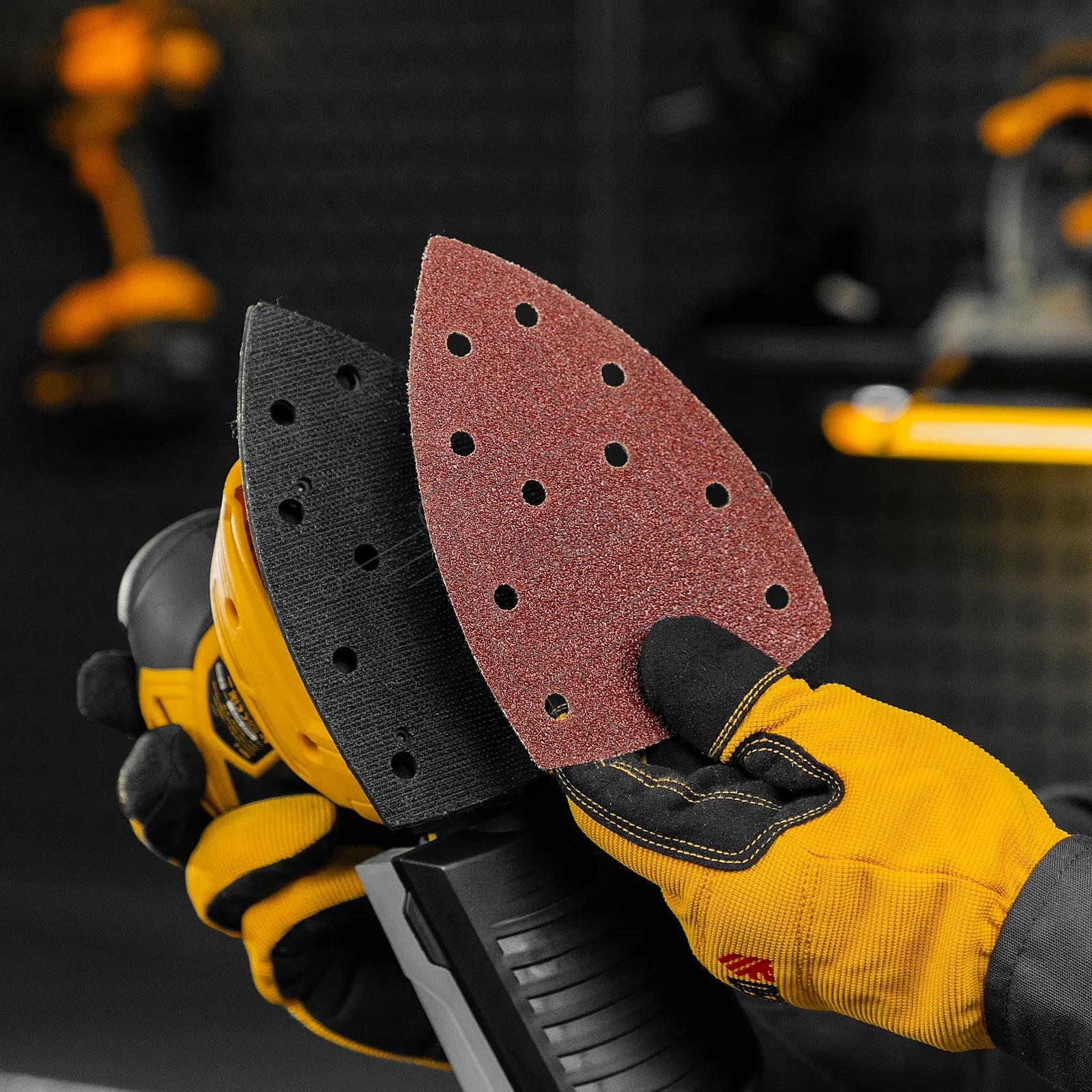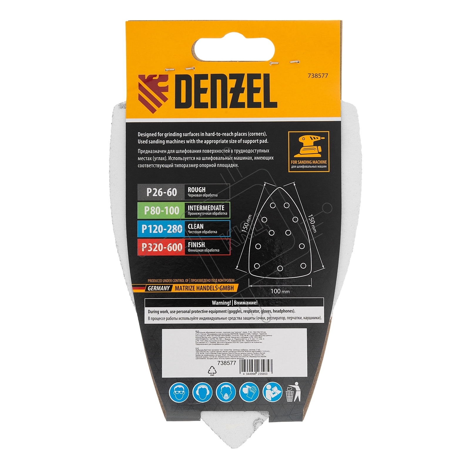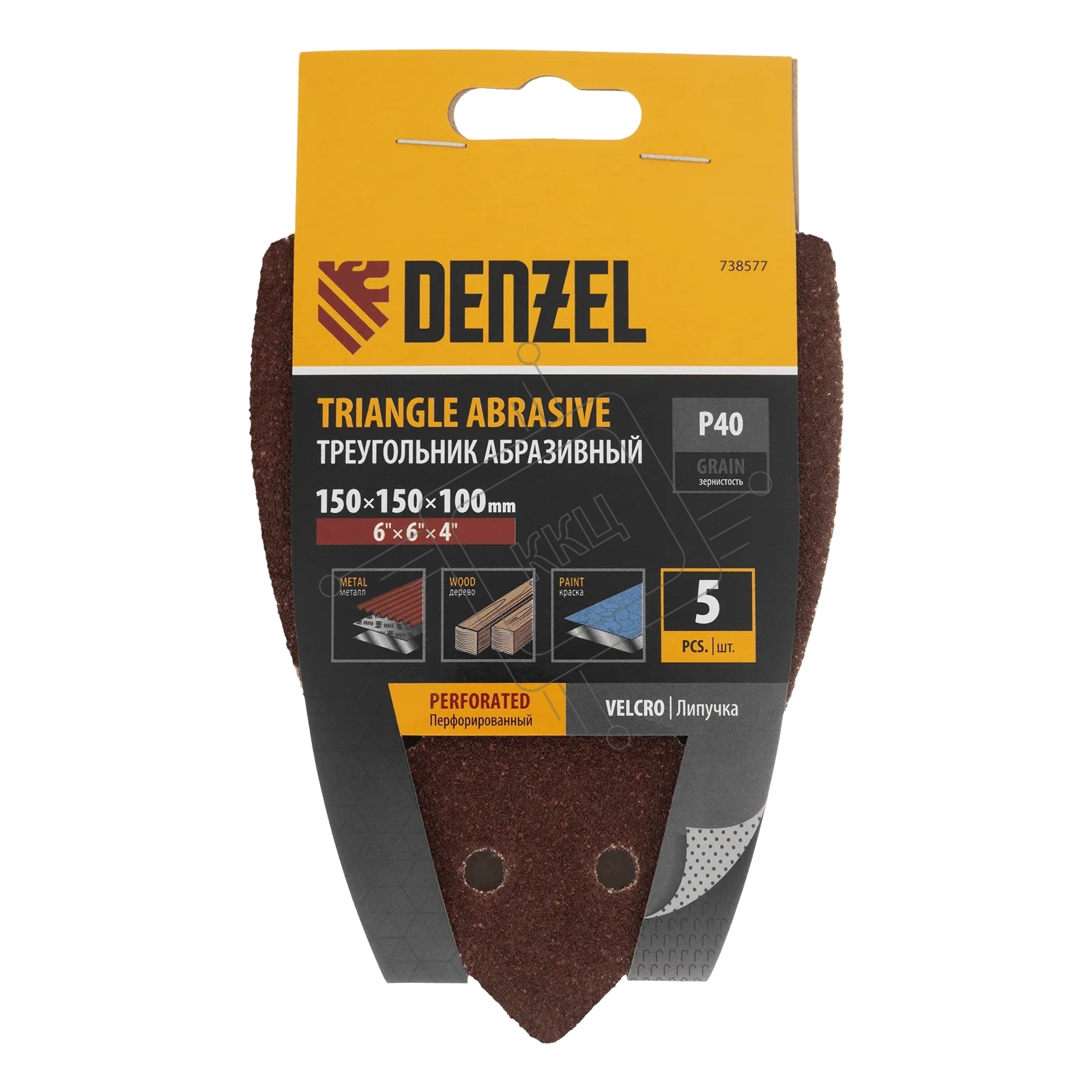 Треугольник абразивный Denzel на ворc. подложке под "липучку", перф., P 40, 150х150х100 мм, 5 шт.