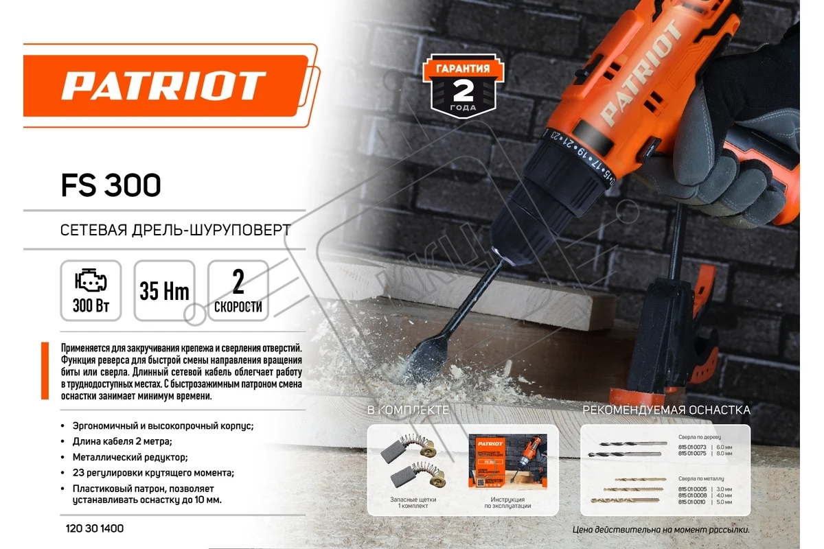 Дрель-шуруповерт Patriot FS 300, Сетевая, 300 Вт, Кейс