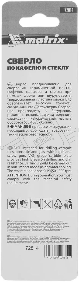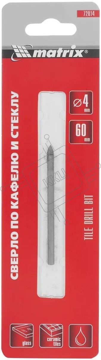 Сверло по керамической плитке и стеклу Matrix, 4 мм, цилиндрический хвостовик