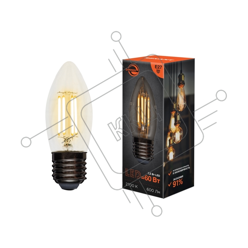 Лампа светодиодная филаментная Rexant Свеча CN35 7.5 Вт 600 Лм 2700K E27 диммируемая, прозрачная колба