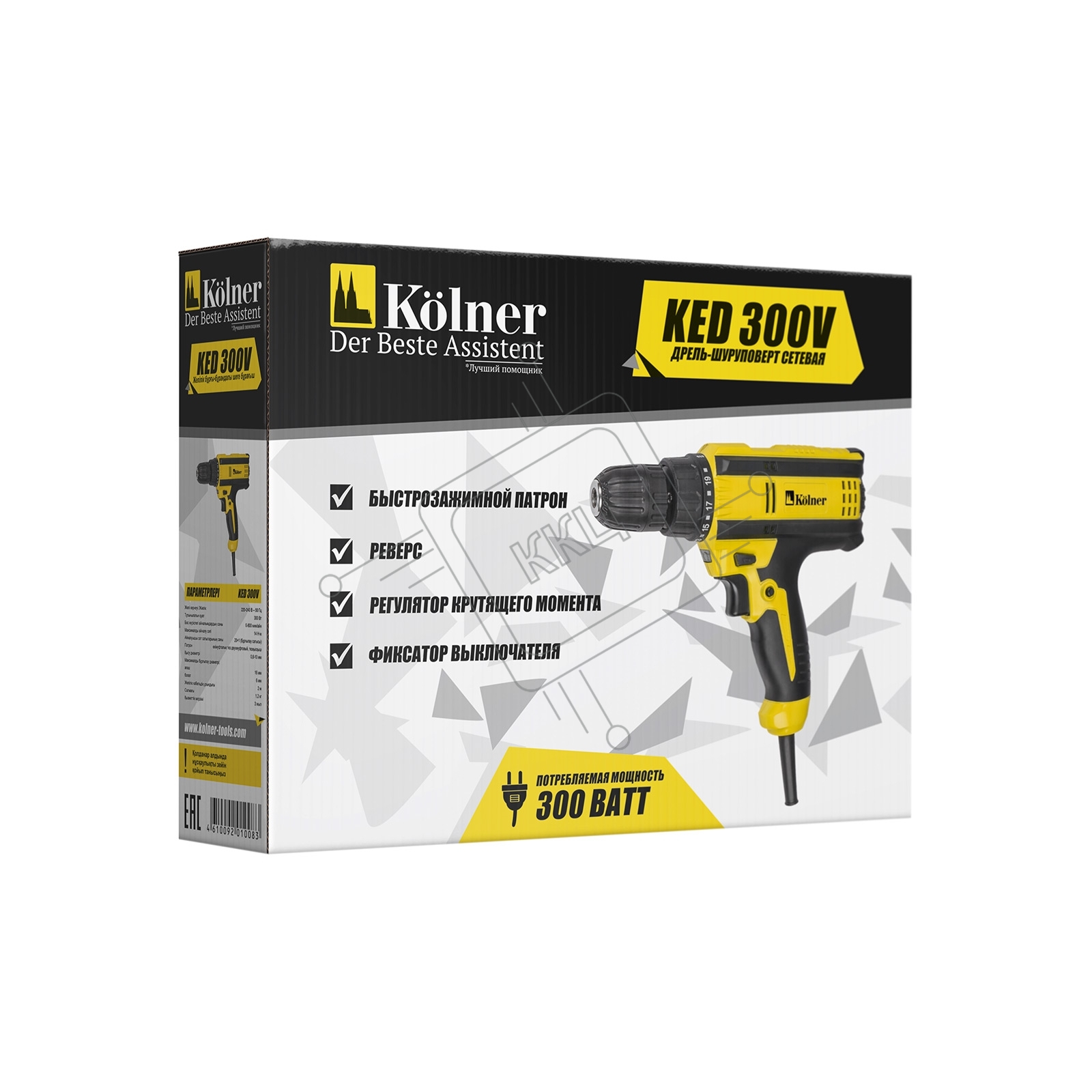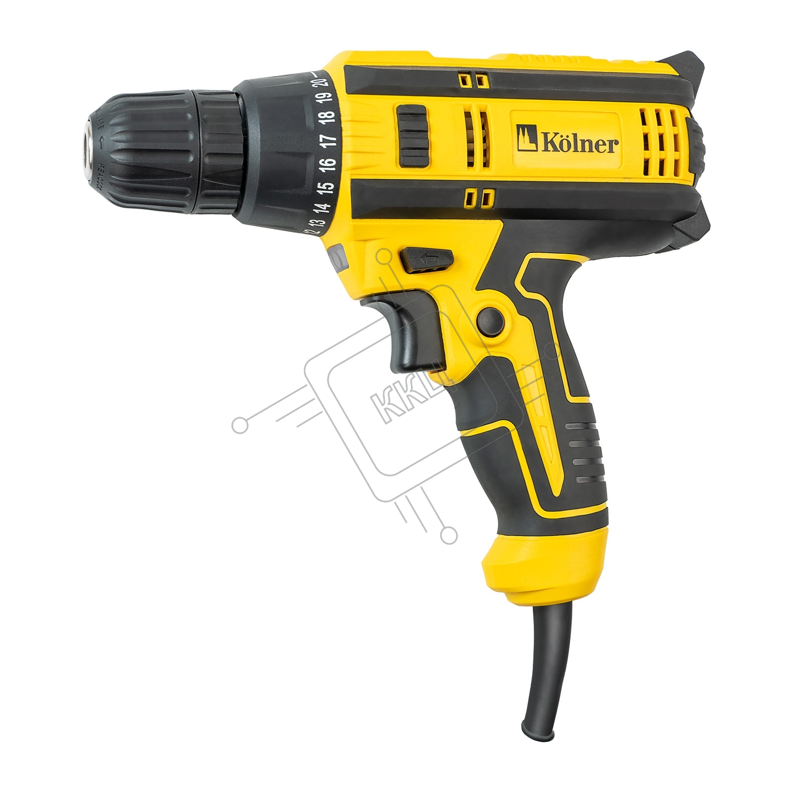 Дрель ударная электрическая Kolner KED 300V 300 Вт, 0- 800 об/мин, быстрозажимной двухмуфтовый патрон 0,8-10 мм, максимальный крутящий момент 14Нм, число ступеней крутящего момента 20+1