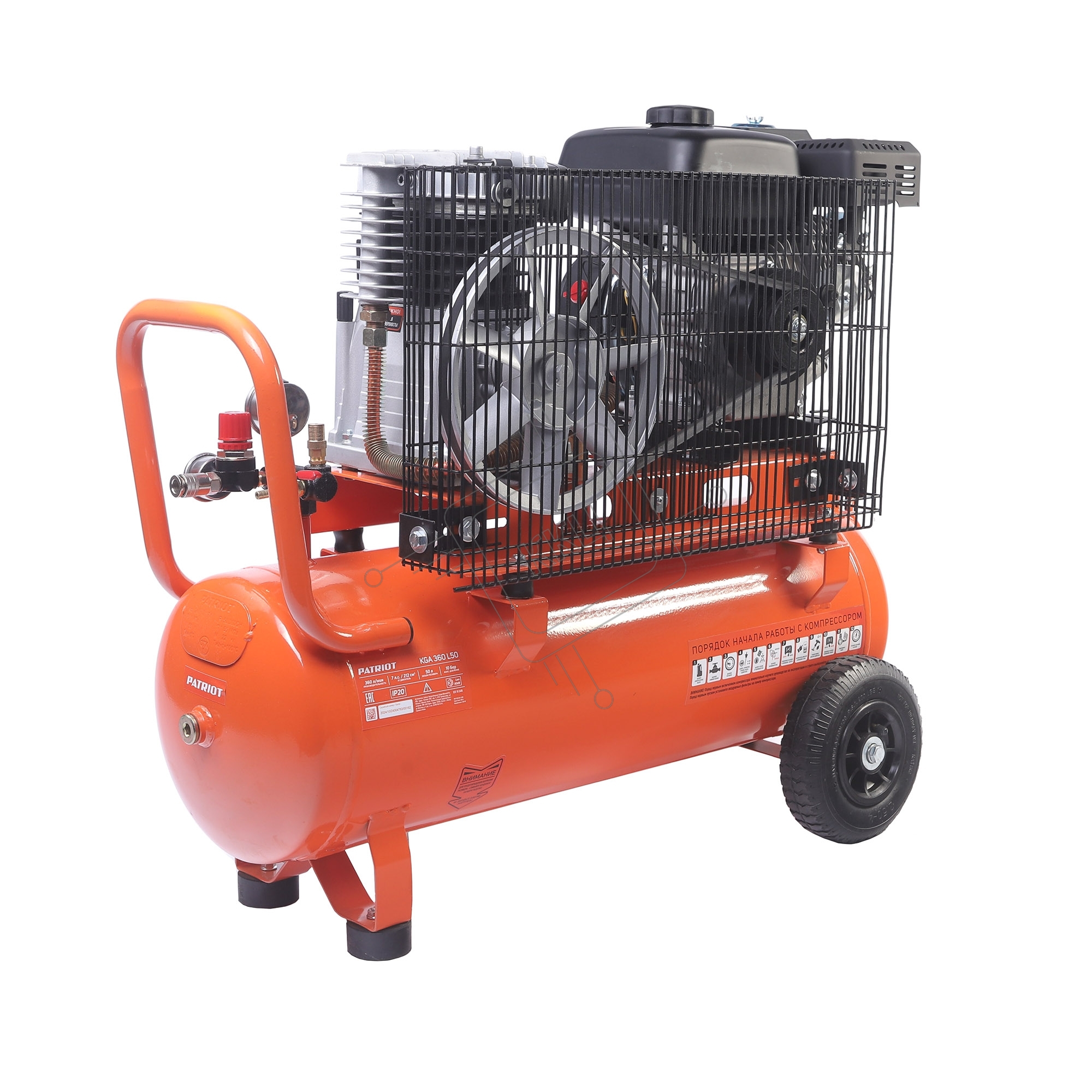 Компрессор Patriot бензиновый KGA 360 L50 - 360 л/мин, 10 бар, 50 л, 7 лс, быстросъем и "елочка" с вентилем