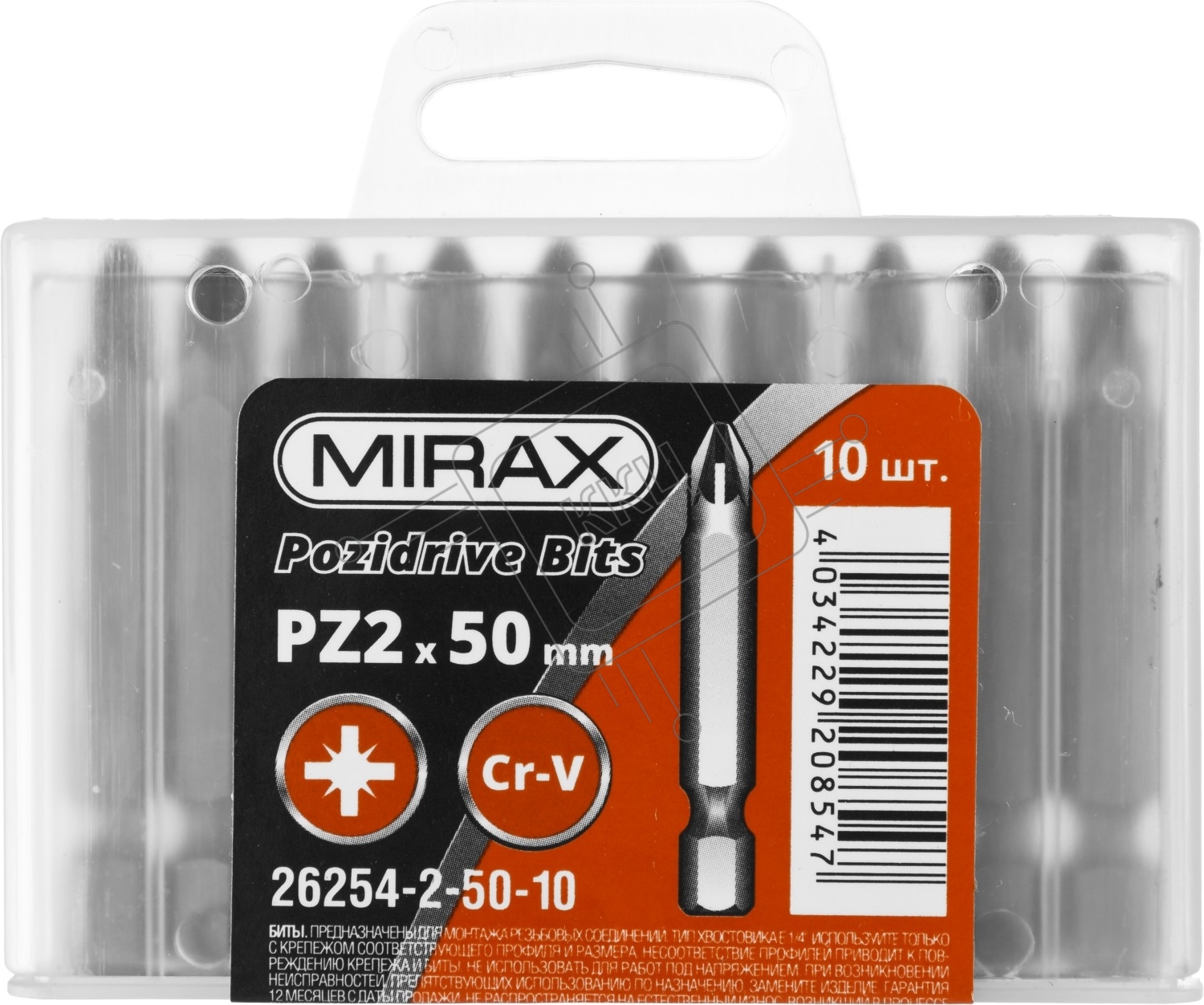 Биты MIRAX PZ№2, тип хвостовика E 1/4", длина 50мм, 10шт