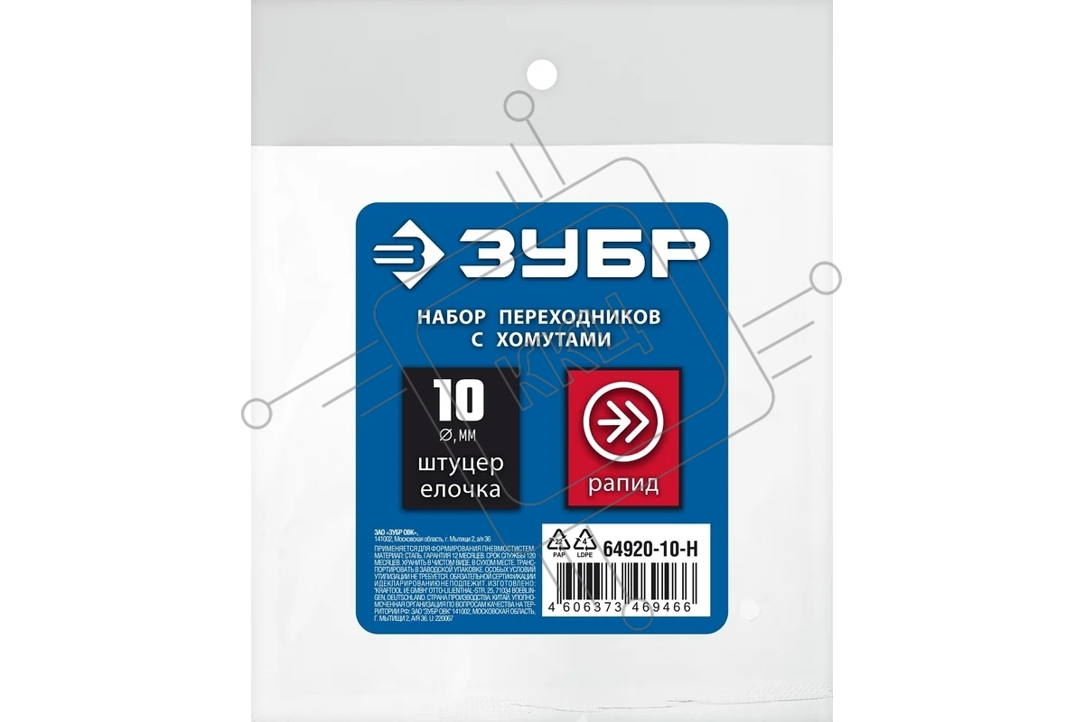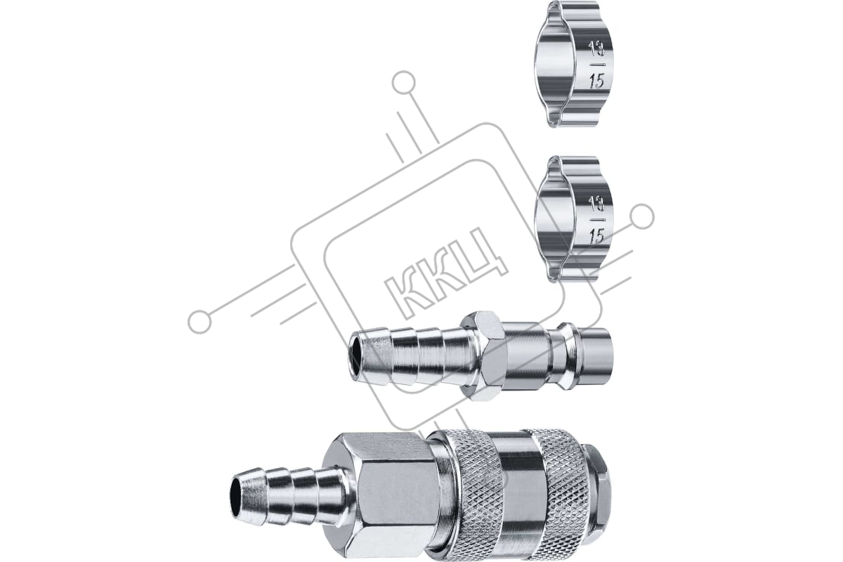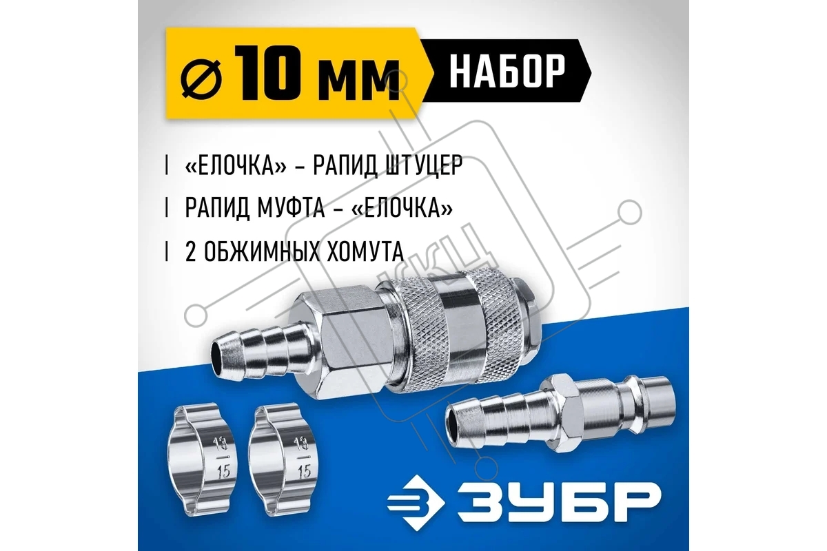 Набор (штуцер "елочка" 10 мм - рапид муфта) + (рапид штуцер-штуцер "елочка" 10 мм) + (обжимные хомуты 2 шт) ЗУБР Профессионал