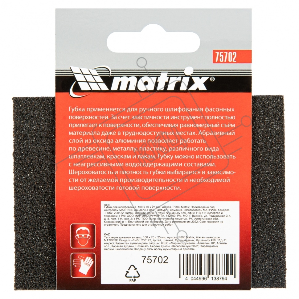Губка для шлифования Matrix, 100 х 70 х 25 мм, мягкая, P 80