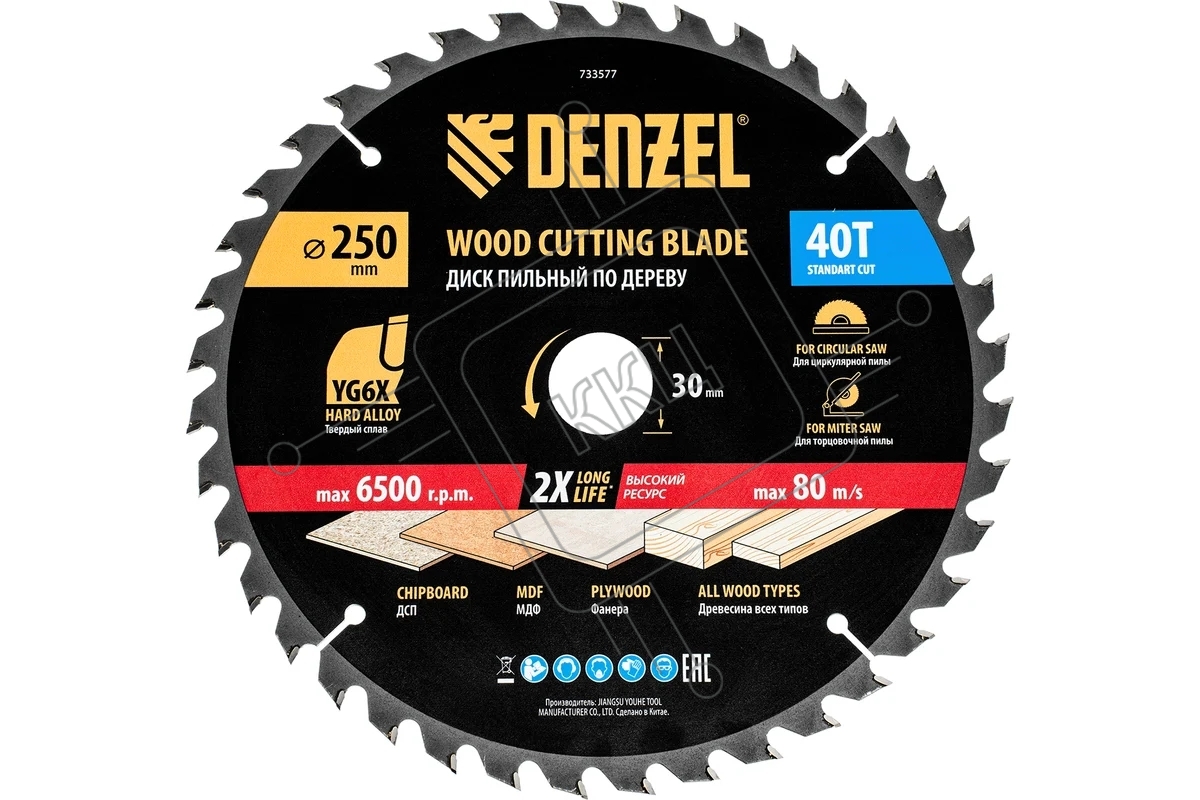 Пильный диск по дереву Denzel ф250 х 30 мм, 40 зубьев 733577