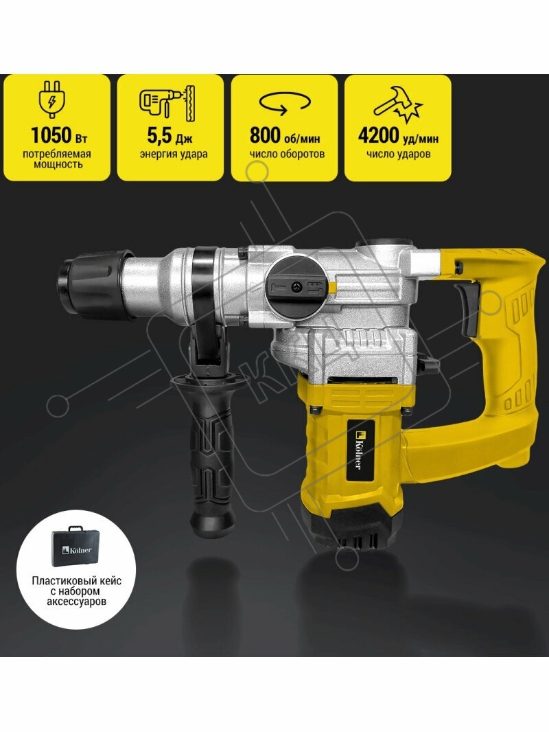Перфоратор, 1050Вт, патрон SDS-PLUS, диаметр сверления 30мм, KOLNER KRH 1050С, 3 режима, энергия удара 5,5Дж, число оборотов на холостом ходу 800об/мин, число ударов 4200уд/мин, кабель 2м, глубинометр (набор оснастки, кейс)