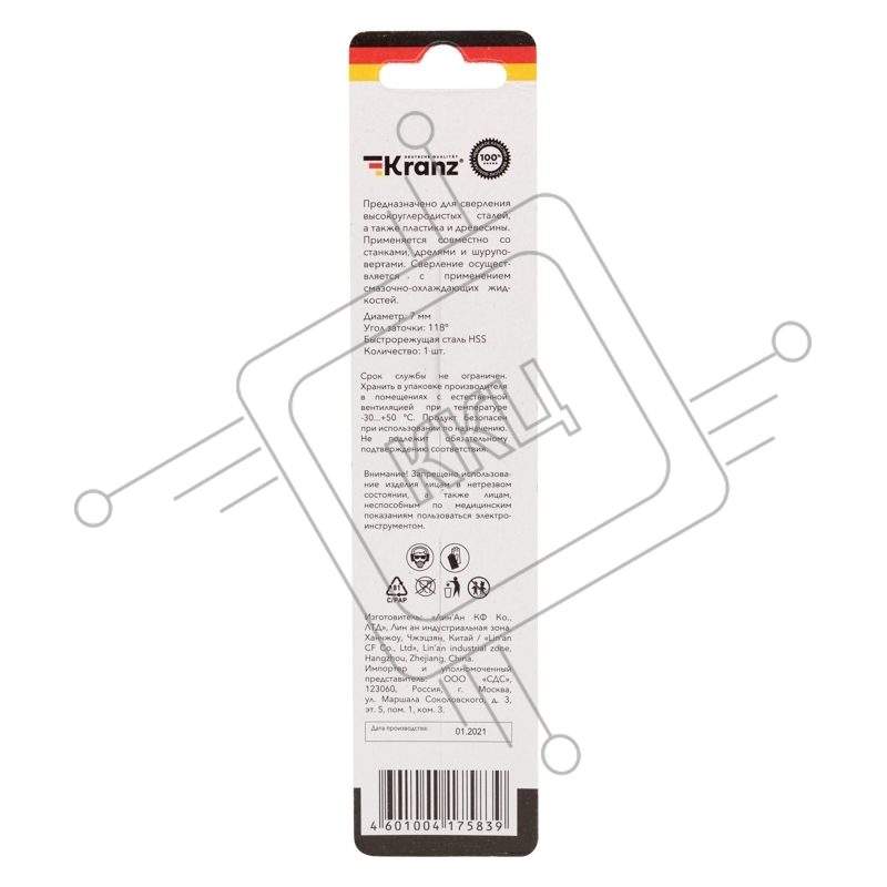 Сверло по металлу 7,0 мм HSS (1 шт. в упаковке) DIN 338 Kranz
