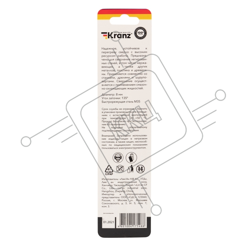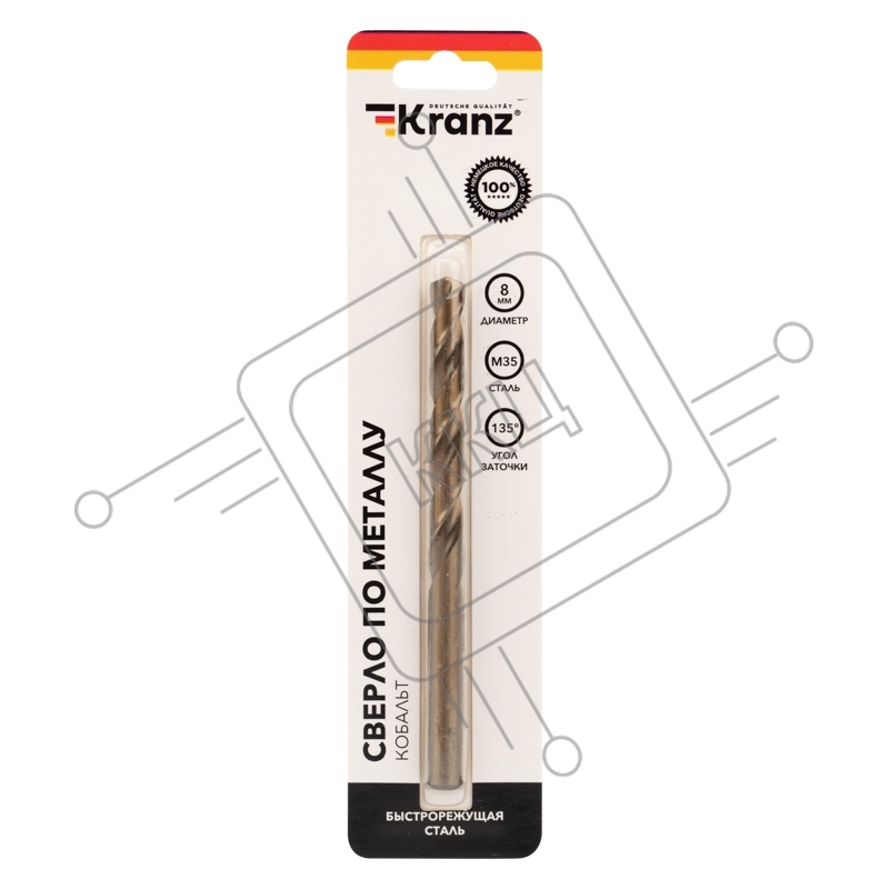 Сверло по металлу 8 мм "Кобальт" (сталь HSS-Co 5% M35 P6M5K5) (1 шт. в блистере) DIN 338 Kranz