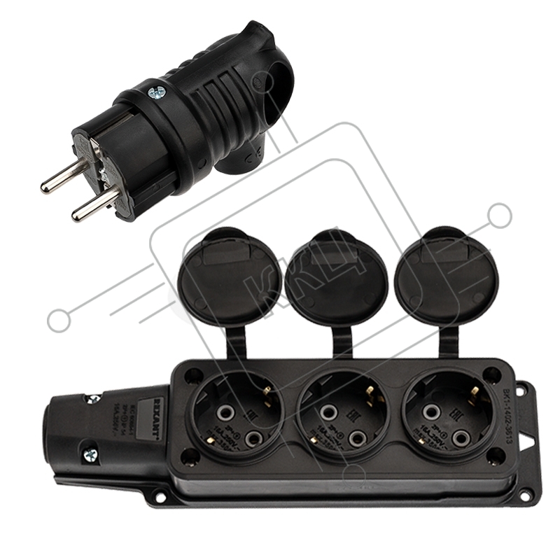 Набор розетка 3 гнезда + вилка угловая 16 А, 2Р+РЕ, IP54 каучук Rexant