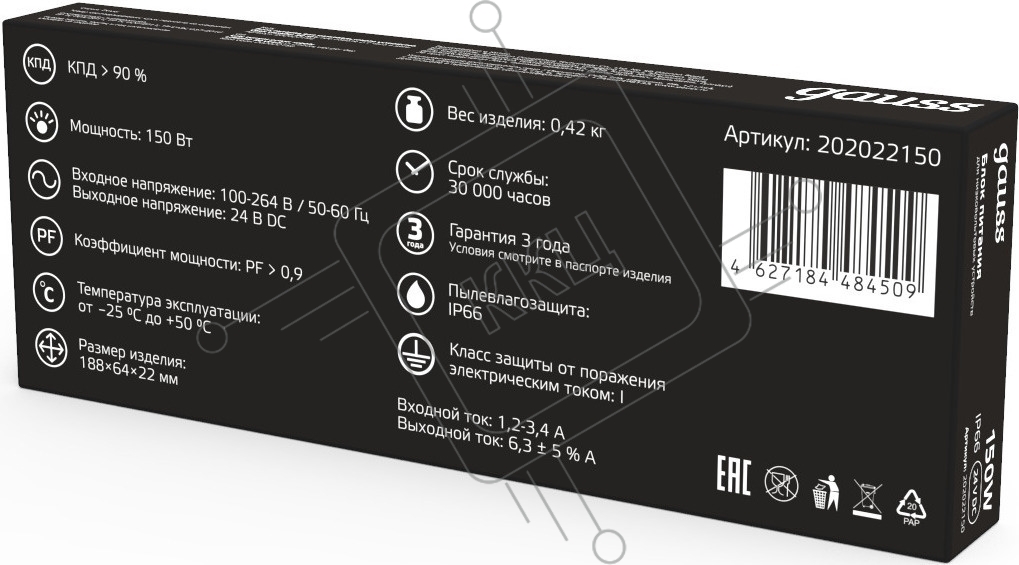 Блок питания Gauss 202022150 пониж. для лен.светод. черный