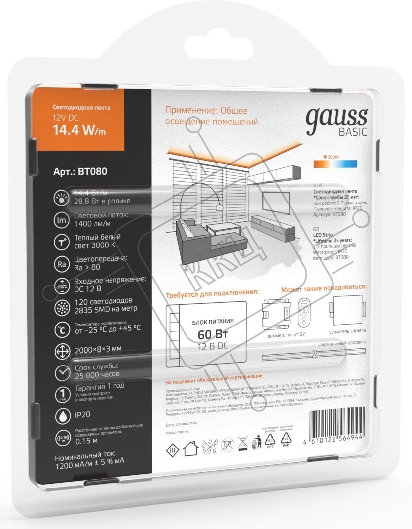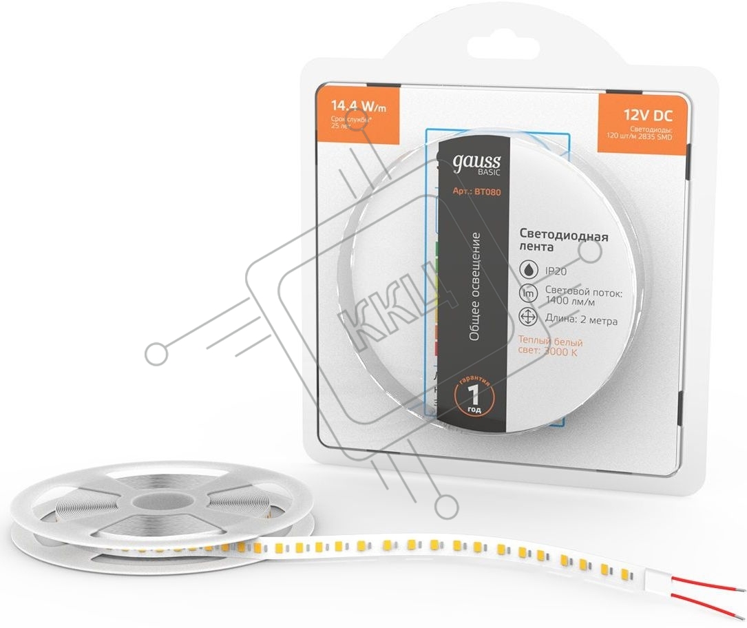 Лента светодиодная Basic 12V 14,4W/m 1400lm/m 3000K IP20 LED 2m 1/100