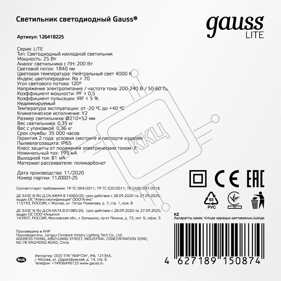 Светильник ЖКХ круг Gauss LITE 25W 1840lm 4000K 200-240V IP65 D210*52мм белый 1/20