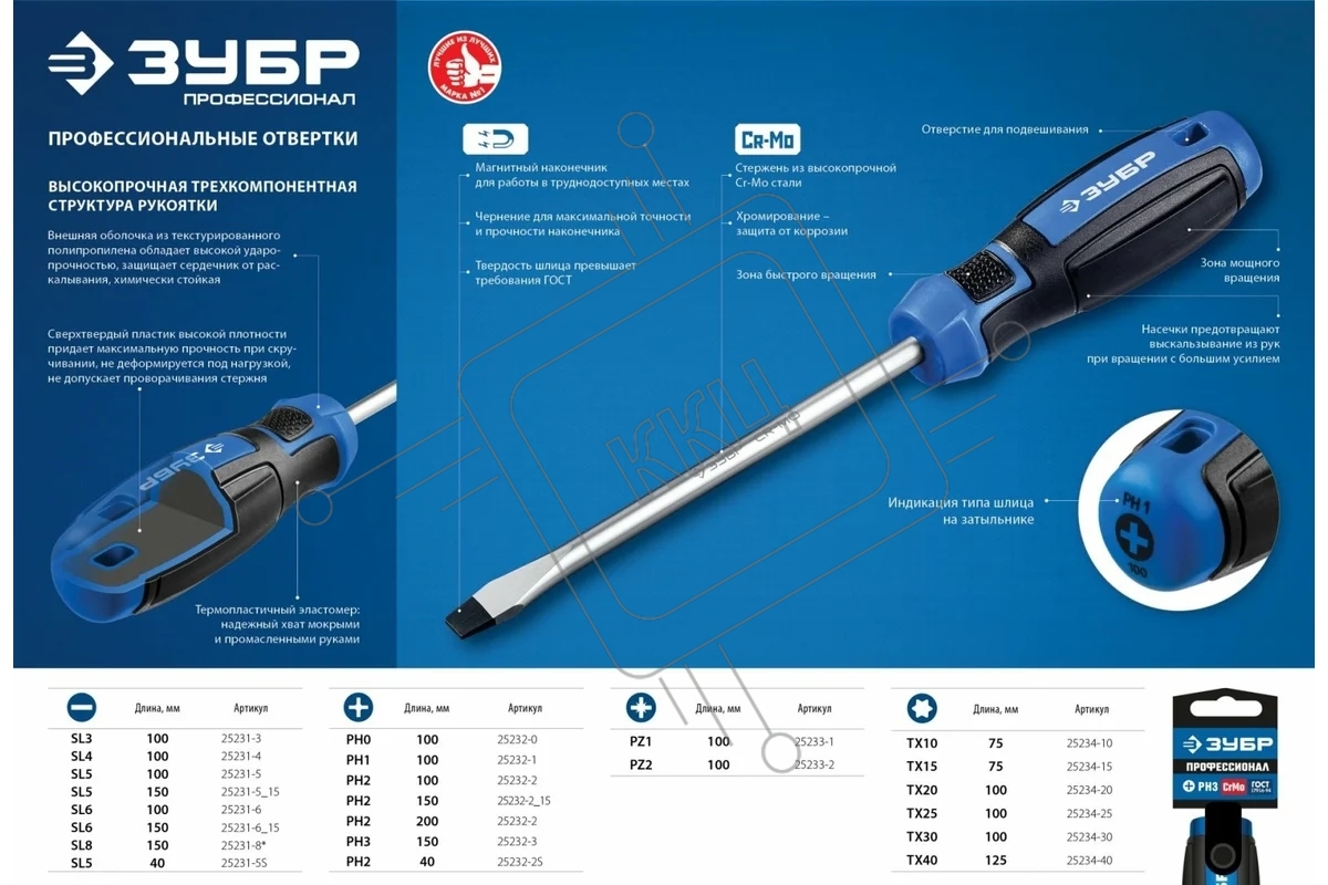 Отвертка KRAFTOOL "EXPERT", Cr-Mo-V сталь, двухкомпонентная противоскользящая рукоятка, SL, 2,5x60 мм 250071-2.5-060