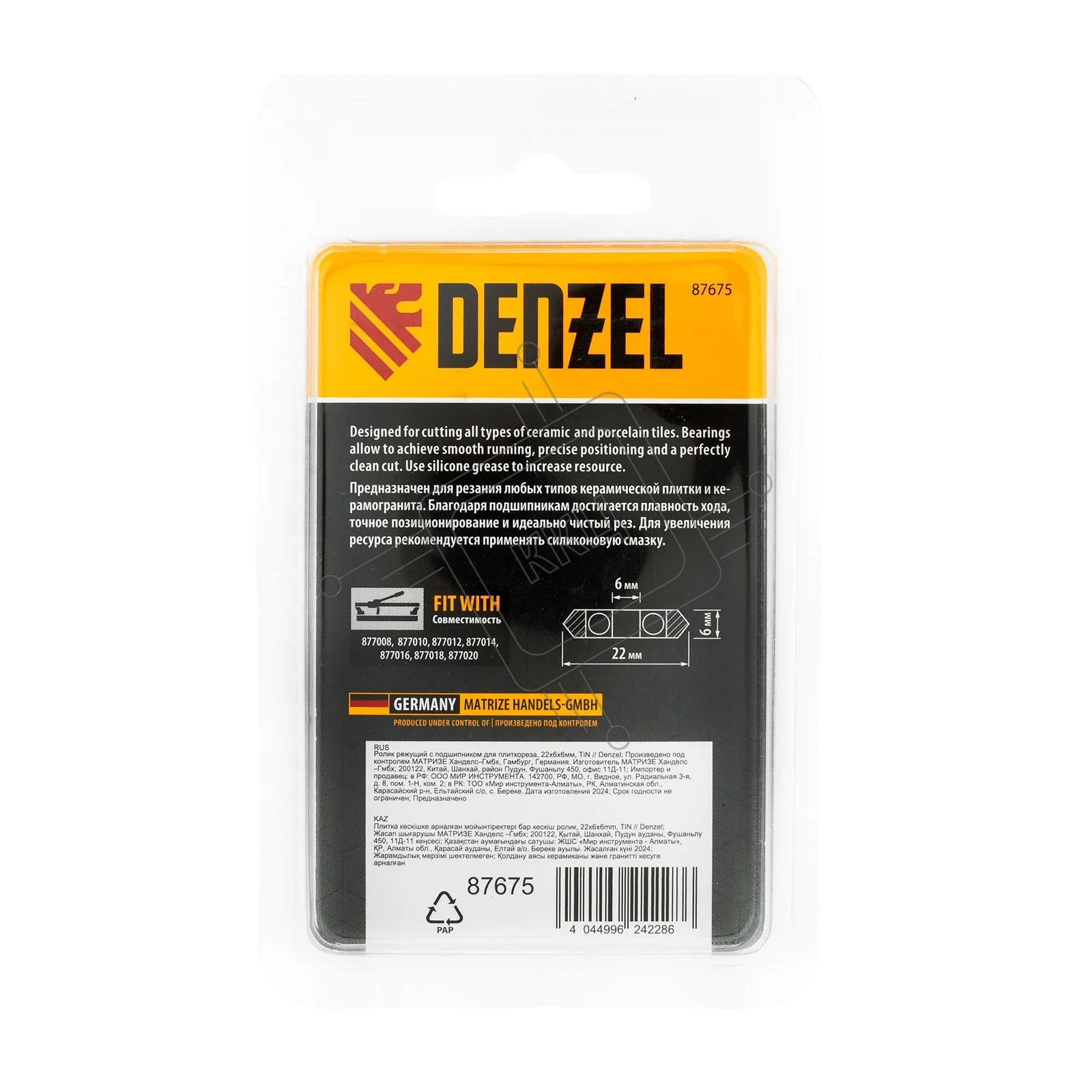 Ролик режущий с подшипником для плиткореза Denzel 22х6х6мм, TiN