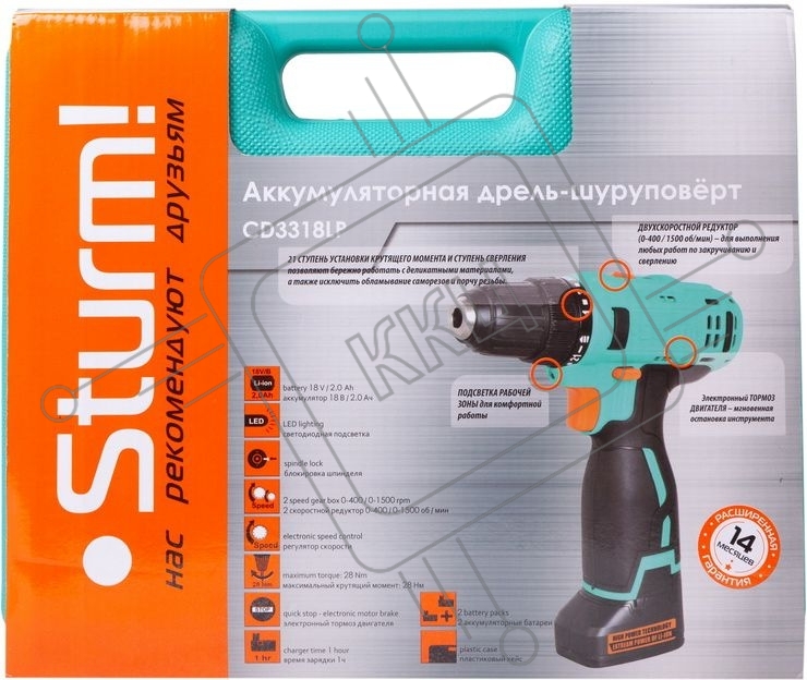 Дрель, Шуруповерт Sturm CD3318LP Дрель акк. Sturm! 18 В, Li-Ion, 2 скор., 2 акк., 2,0 Ач, БЫСТР.ЗАРЯД, ПОДСВ, кейс CD3318LP