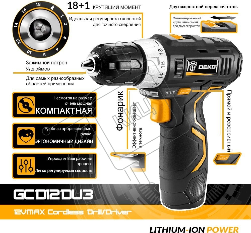 Дрель-шуруповерт аккумуляторная Deko GCD12DU3 SET 3, 12В, 2 АКБ, Кейс