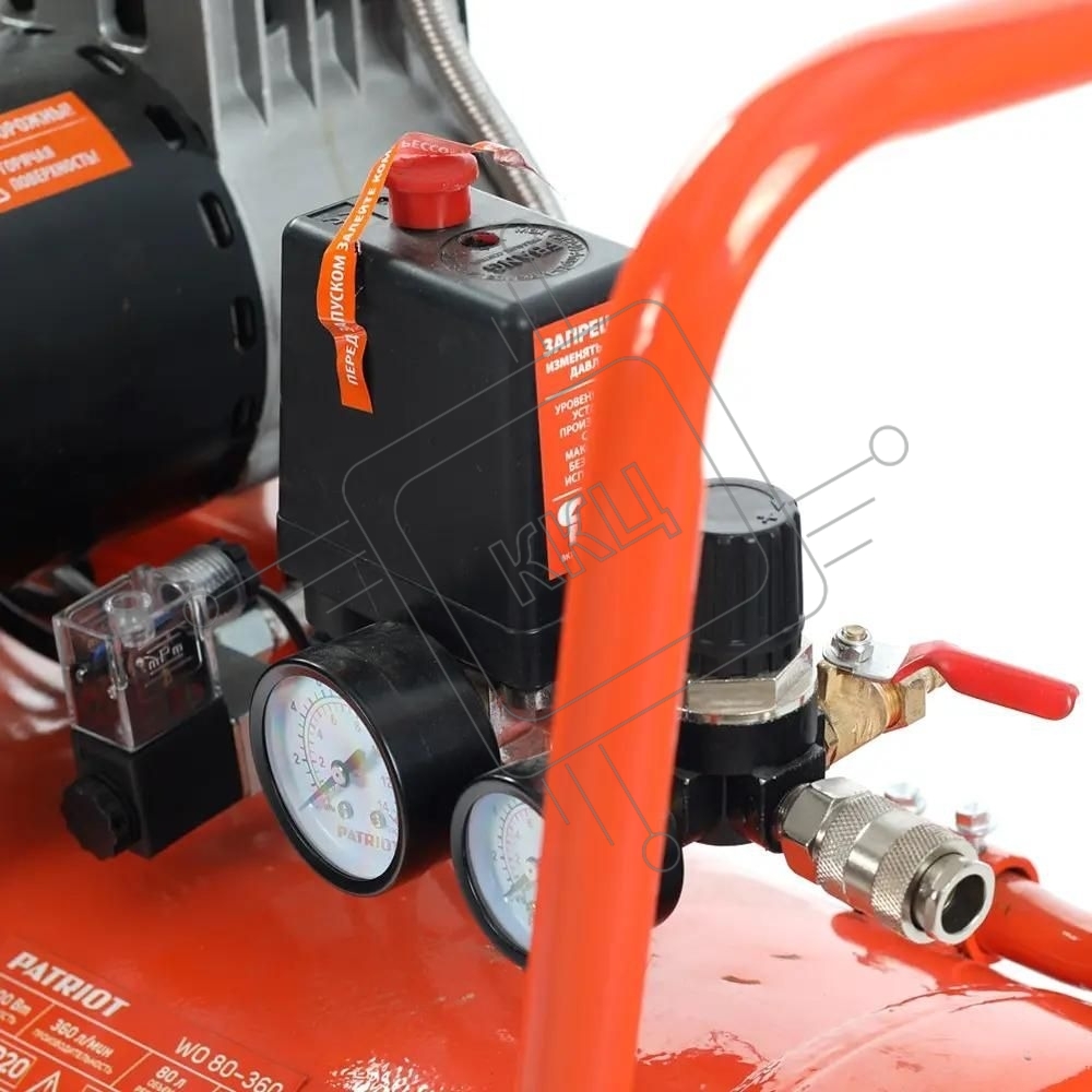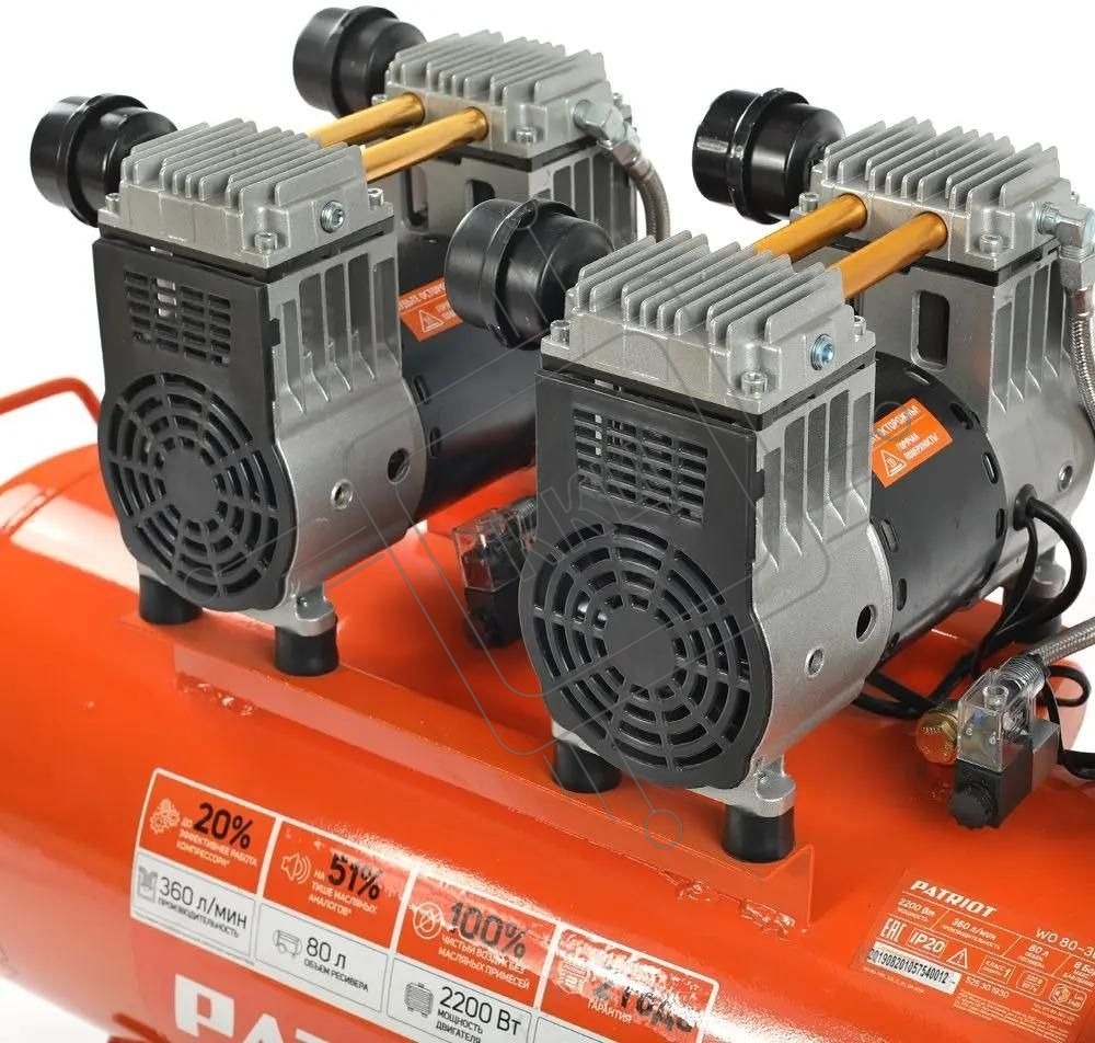 Компрессор Patriot поршневой безмасляный WO 80-360, 360 л/мин, 8 бар, 2200 Вт, 80 л, быстросъем и "елочка" с вентилем