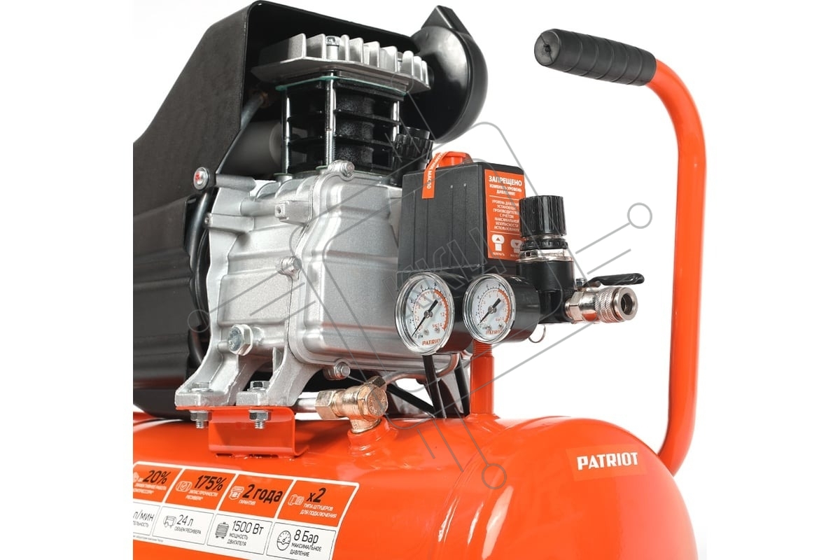 Компрессор PATRIOT WO 24-160 525306375 Безмасляный; Мощн. 1,1 кВт; Напр. 230В Об. двиг.: 2850 об/мин; Производительность: 160 л/мин; Объем ресивера: 24 л; Давление: 8 бар