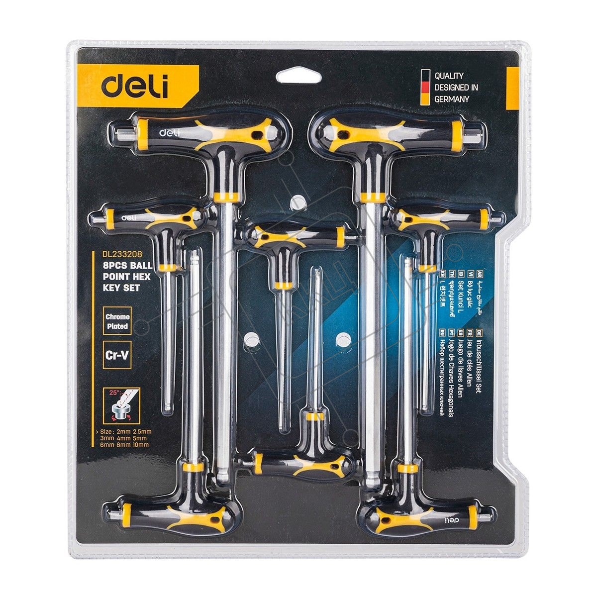 Набор шестигранных ключей с шаром Deli DL233208 8 шт. Материал: CR-V. Спецификация: 2x75 мм/2,5x75 мм/3x100 мм/4x100 мм/5x150 мм/6x150 мм/8x200 мм/10x200 мм Удобная рукоять.