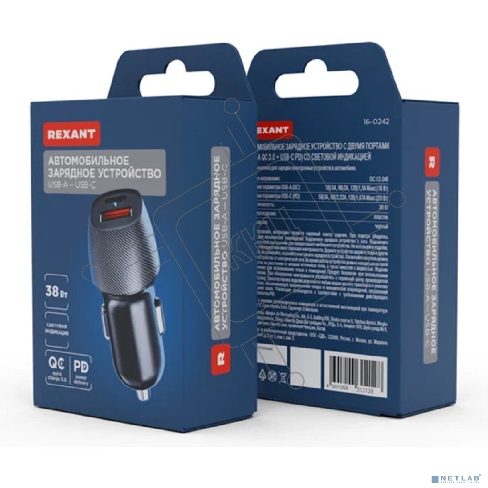 Автомобильное зарядное устройство с двумя портами (USB-A QC 3.0 + USB-C PD) со световой индикацией, 38Вт, черное Rexant