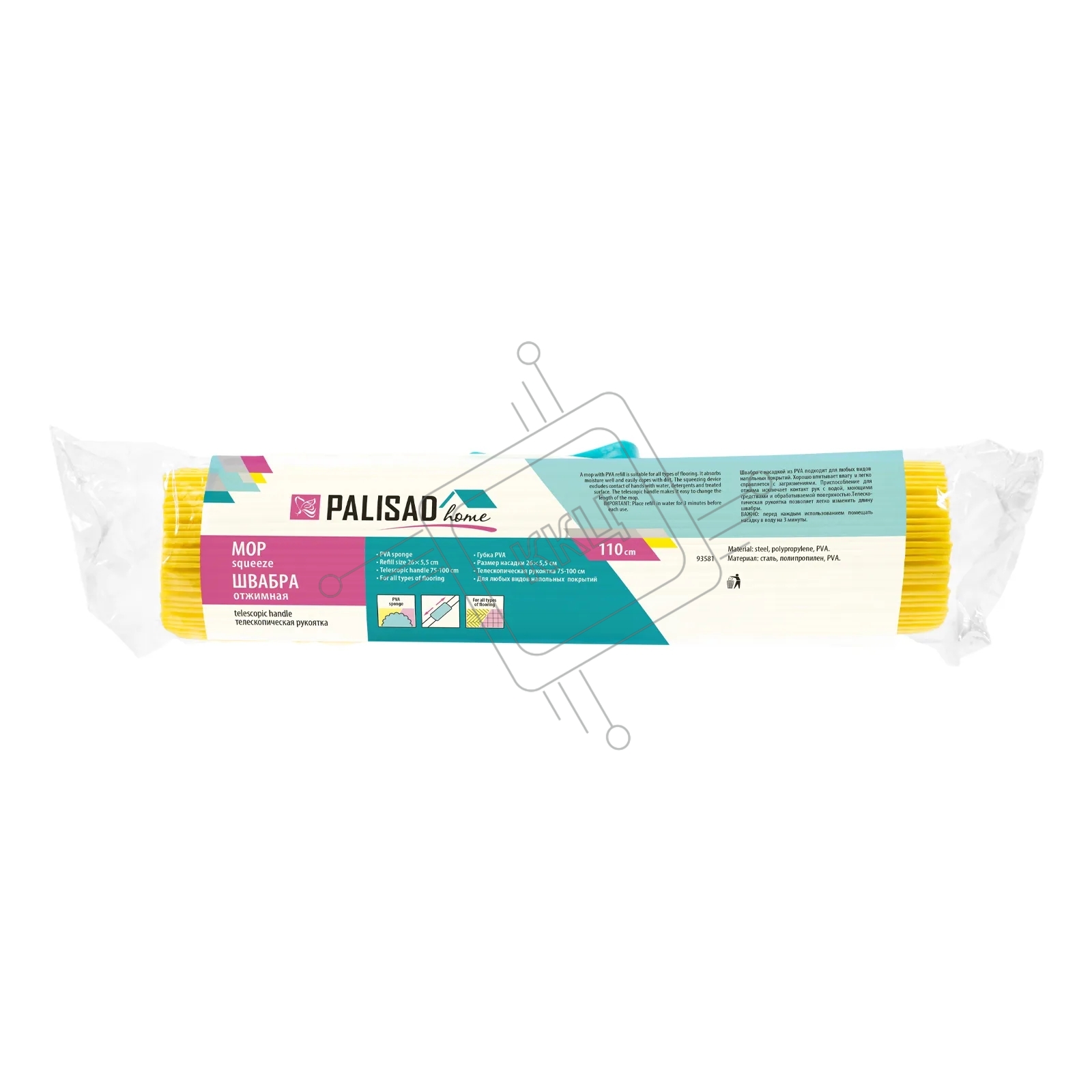 Швабра отжимная Home Palisad 110 см, губка PVA 26х5,5х6 см, телескопическая рукоятка, бирюзовая