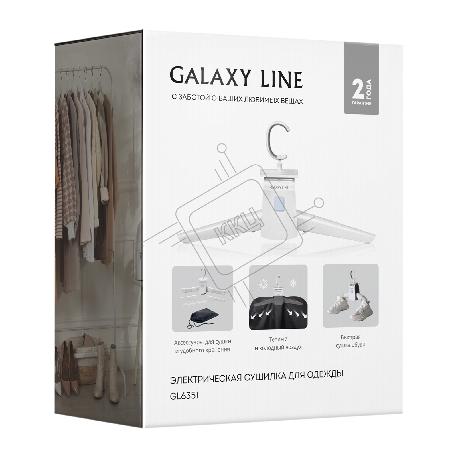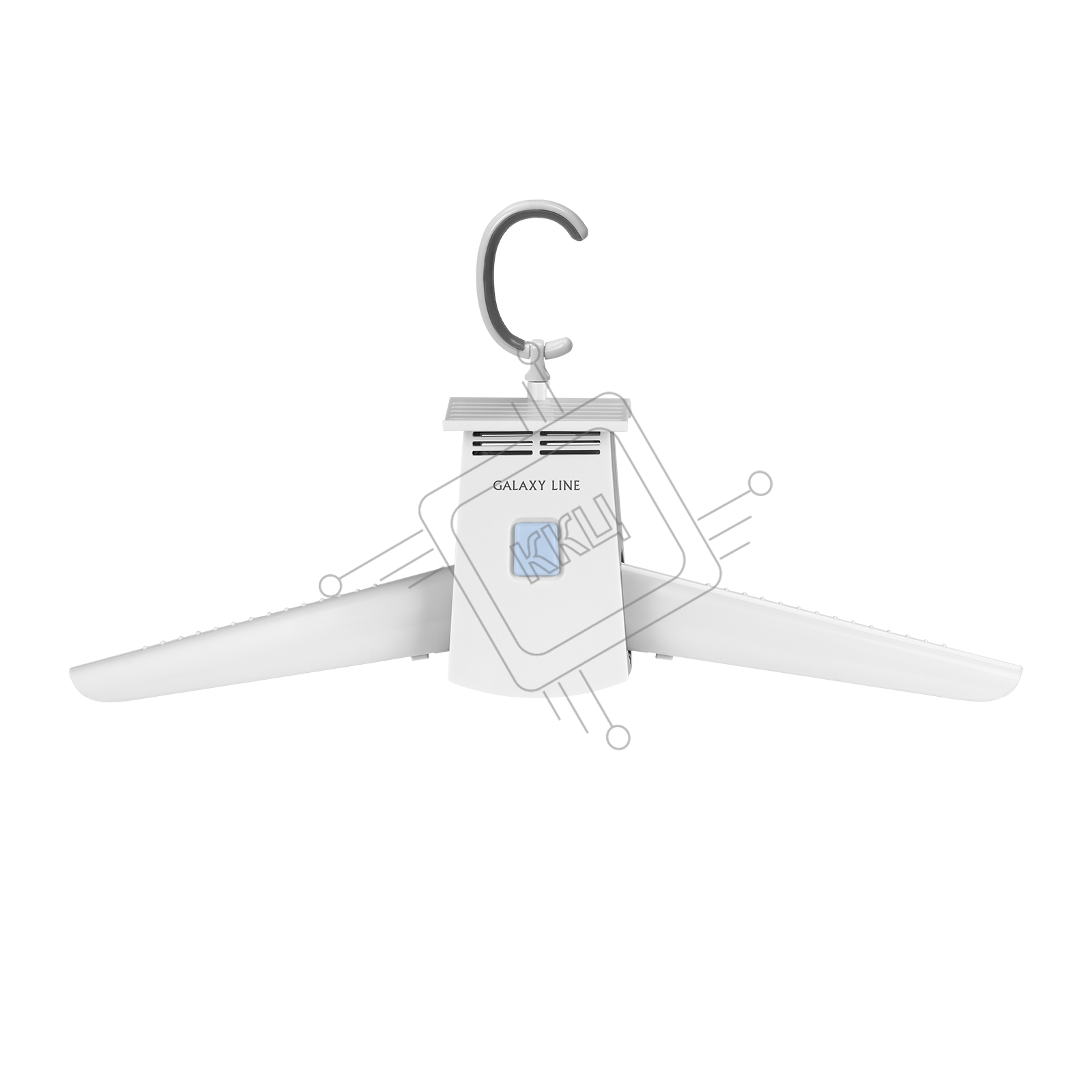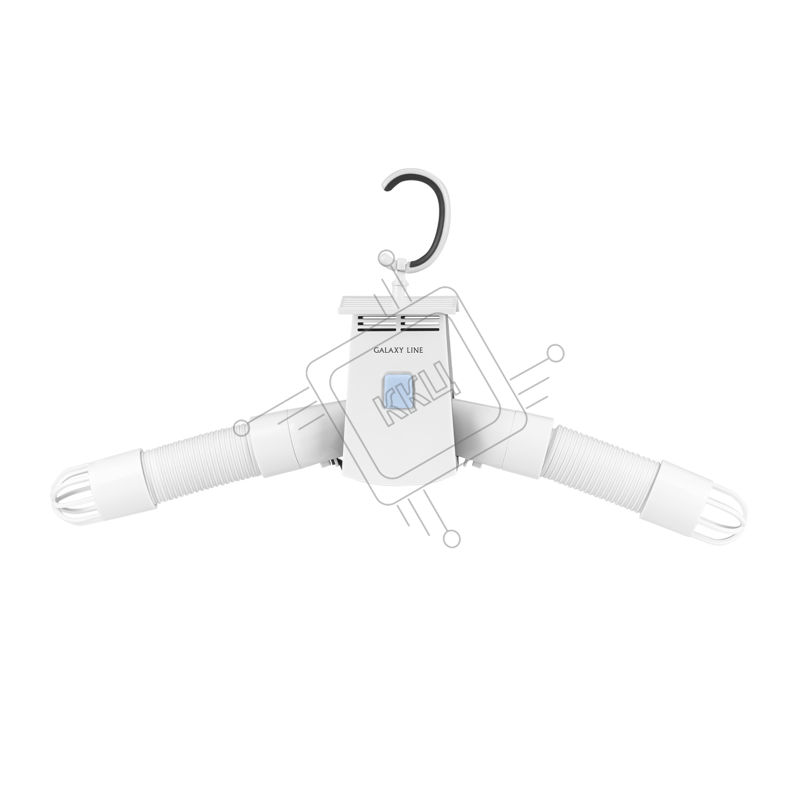 Сушилка для одежды Galaxy LINE GL 6351, белый, 180 Вт, 2 режима работы (холодный и горячий воздух), класс влагозащиты IPX1, максимальная нагрузка 5 кг, режим ожидания 8 часов, аксессуары: 2 шт. держатель для одежды длиной 18.5 см, 2 шт. воздуховоды для об