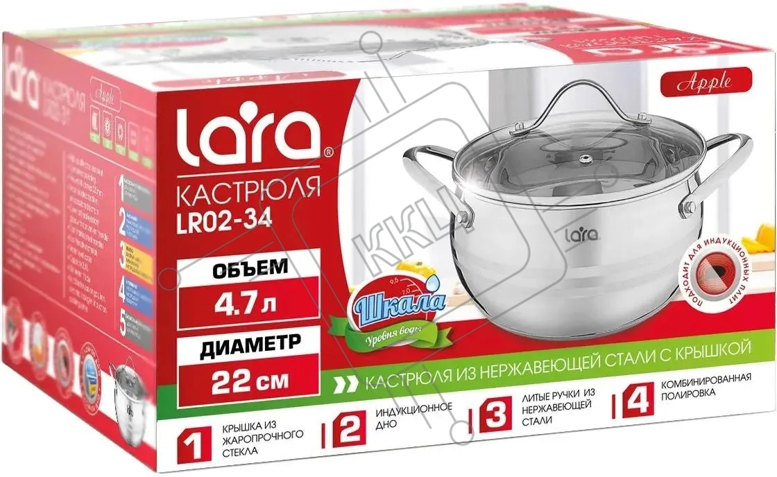 Кастрюля LARA LR02-34 APPLE 22x12,5 см, 4.7 л, нержавеющая сталь, с крышкой