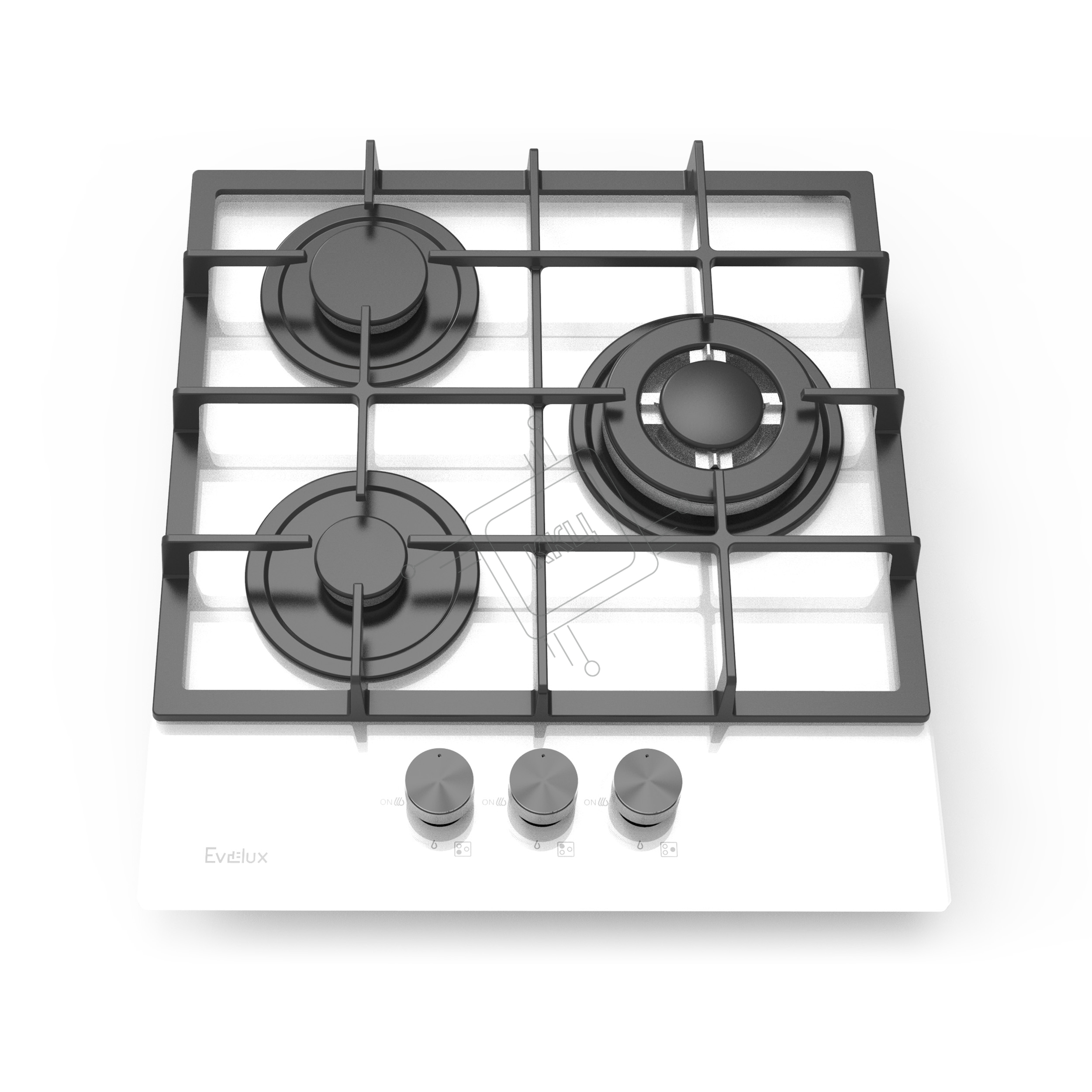 Газовая варочная панель Evelux HEG 425 WG Hi-Tech, 45 см, 3 конфорки, WOK-конфорка, чугунные решетки, газ-контроль, электроподжиг, механическое управление, белый