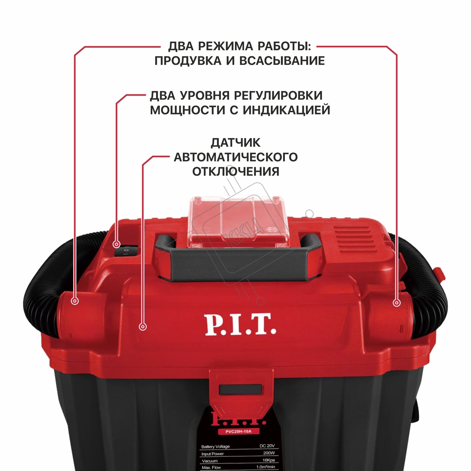 Строительный пылесос P.I.T. PVC20H-10A SOLO красный, питание от аккумулятора, 200 Вт, уборка сухая/влажная/выдув, пылесборник 10 л